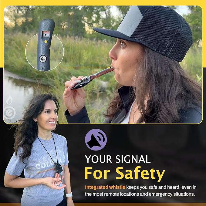 - Premium Full Tang Design: The Contour Feather features a full tang construction, offering superior strength and stability. Crafted from VG10 steel with a Rockwell hardness of HRC58-60, this knife ensures a sharp edge and outstanding durability for demanding tasks. Its compact 2" blade is perfect for precision tasks, yet strong enough for heavier cutting like baton splitting. The handle also includes a loud 115dB safety whistle to signal for help when needed.