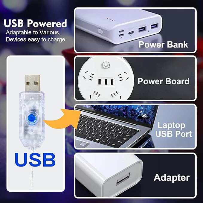 - USB & Battery Dual Powered July 4th string Lights: 2 power supply methods are suitable for anywhere; No more worrying about power outlet or changing batteries frequently; Use USB plugs indoors to achieve optimal lighting effects; Outdoors or in places without sockets, you can use batteries for power supply; Decorate Independence Day party with our string lights now (Note: USB power adapter and 3AA battery are not sold with the order)