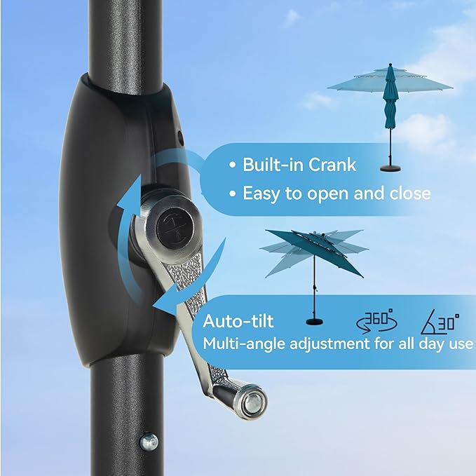 - 【Convenient Crank & Tilt System Table Umbrella】This outdoor umbrella is designed with crank open system for easy and quick use,The Auto tilt for all day use,for more angles of shading, keeping away from the hot sunlight. Ideal for both residential and commercial locations