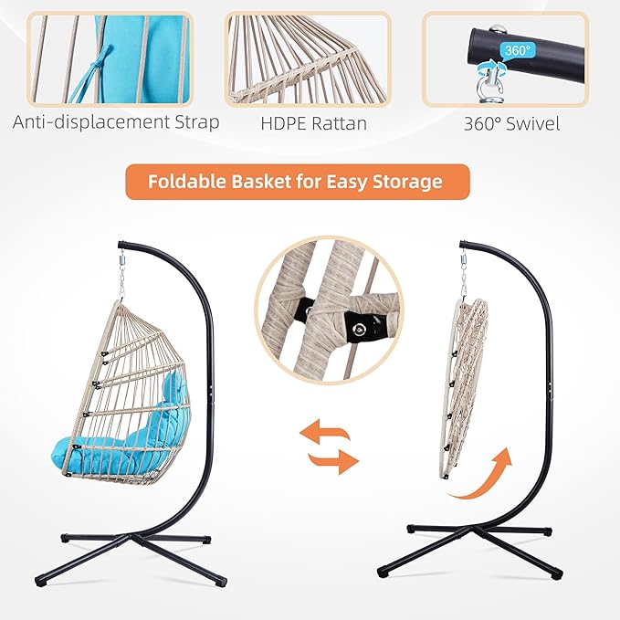 - 【Foldable Design for Easy Storage】Featuring a space-saving foldable design, this swing egg chair can be conveniently folded when not in use, making it perfect for small spaces, camping trips, or easy relocation. Simple setup allows for effortless assembly and disassembly—no special tools required.