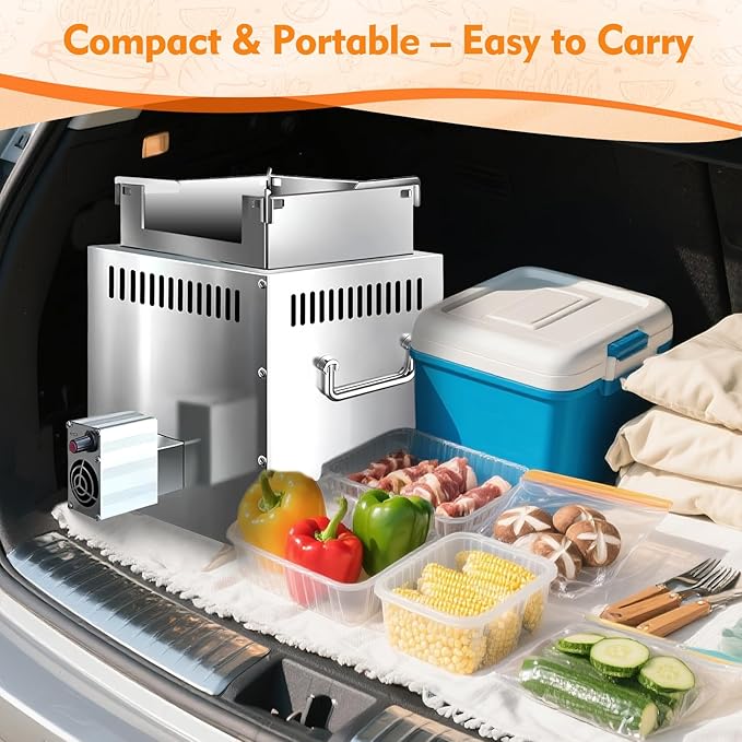 - 🎒【Portable & Easy to Assemble】Compact and lightweight, with insertable wind guards, it’s perfect for camping, backyard cooking, RV living, or emergencies. Comes with wind shield, hooks, USB cable, turbo fan, and clips for convenience. (NOTE:power bank not included)