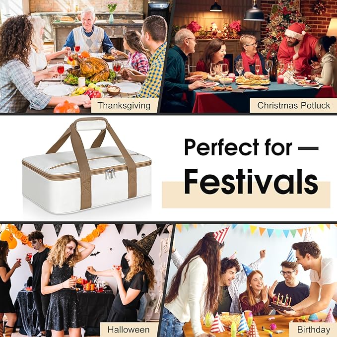 - Details: The casserole dish carrier bag adopt double zipper design, easy to open and close; The internal aluminum film not only holds heat but easy wiped clean with paper towels when encountering dirt; Note: Not machine washable