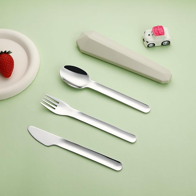 - 3. Stylish design: Travel utensils include a knife fork and spoon. They are mirror polished with unique shape, beautiful and dishwasher safe. Dine in style and enjoy the feeling of fine cutlery wherever you are.