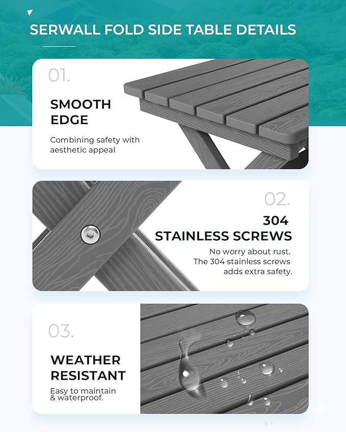 - [Foldable Outdoor Side Table] The SERWALL Adirondack Side Table features a foldable design that significantly reduces its footprint when folded, providing an optimal space-saving solution for outdoor enthusiasts.