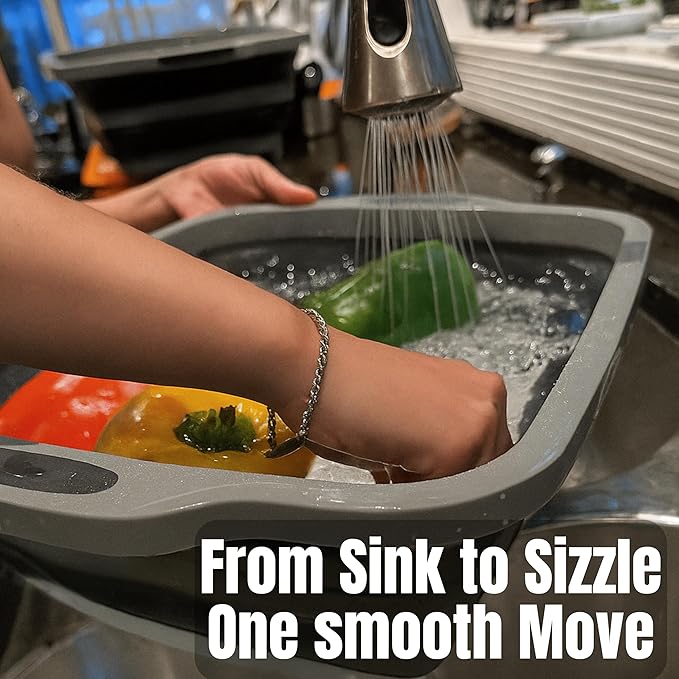 - Shape-Shifting Magic – Collapsible Design – Use fully expanded for large meal prep, half-collapsed for small batches, or fully flat for slicing or serving. Folds down to 1.5" for easy storage—perfect for camping, BBQs, RVs, tailgating, and small kitchens.