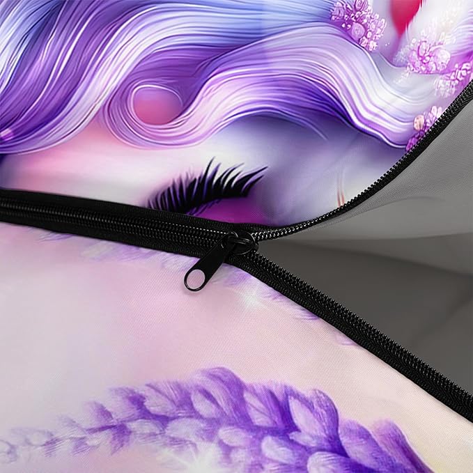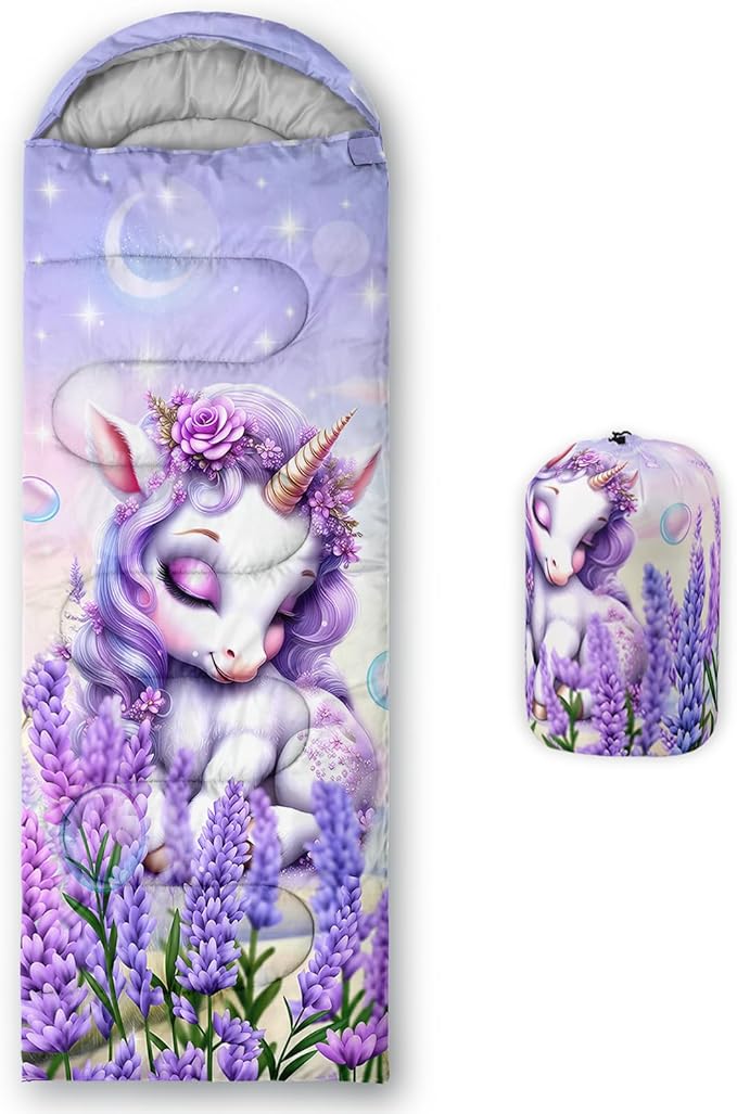 - 【Design】The purple unicorn-themed sleeping bag is a must-have for every girl's outdoor camping.The beautiful pattern can add a wonderful touch to your outdoor activities.The sleeping bag is made of light and comfortable material,which is easy to store and carry.