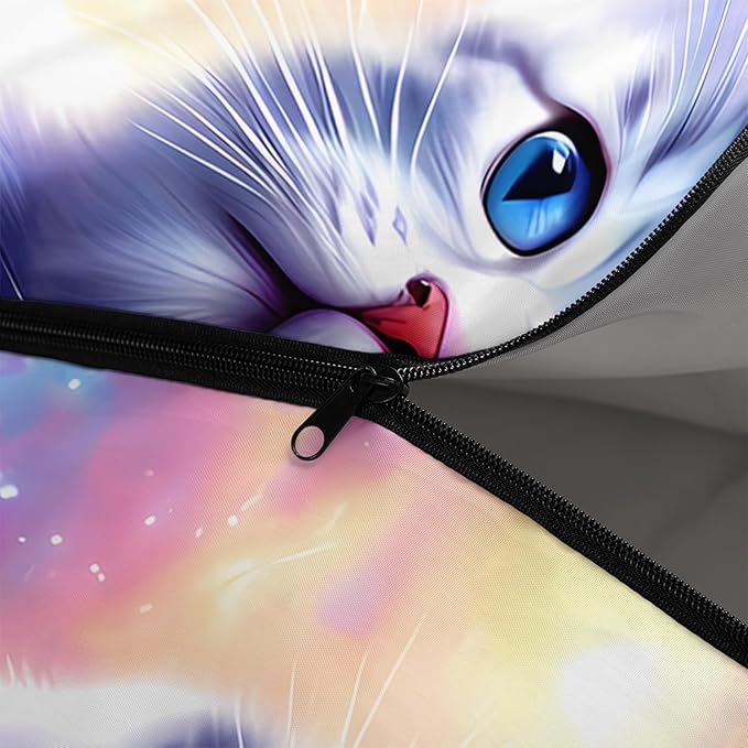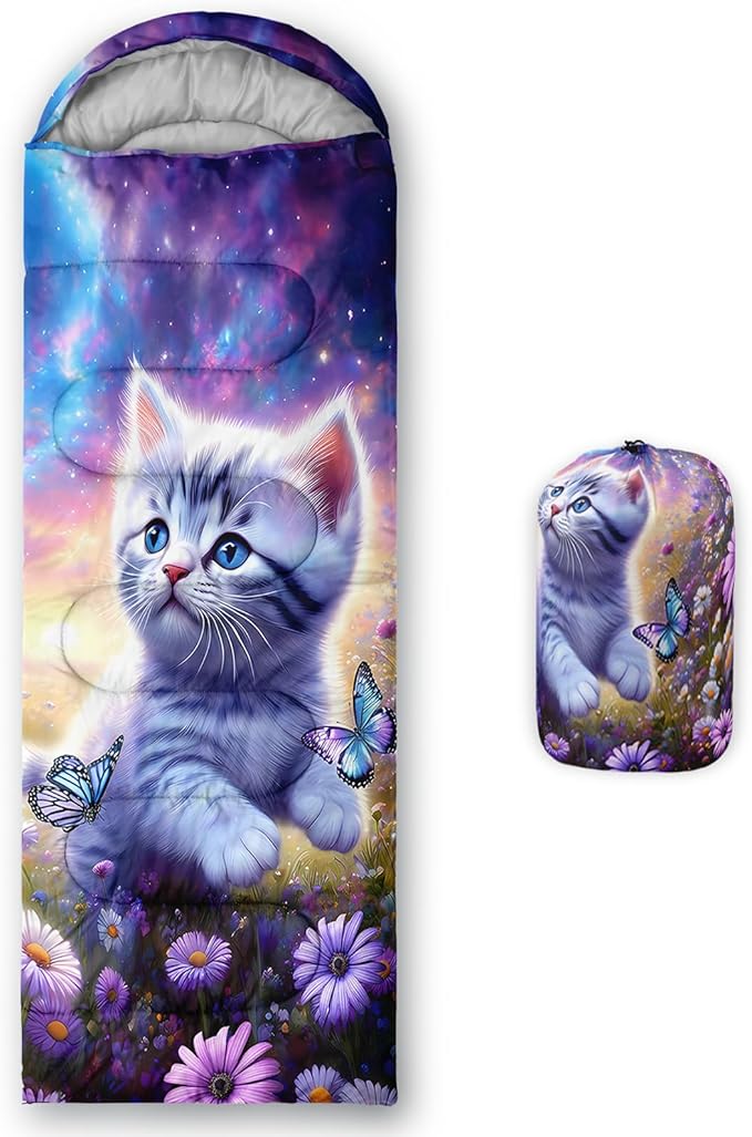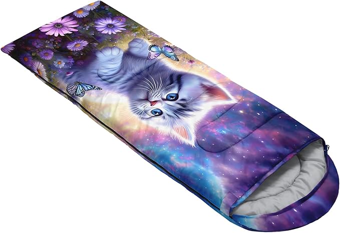 - 【Design】If your child is a lover of both cats and outdoor activities,this cute cat sleeping bag is a great gift choice.It features a cute cat looking up at the stars among the flowers,full of wonderful artistic colors.