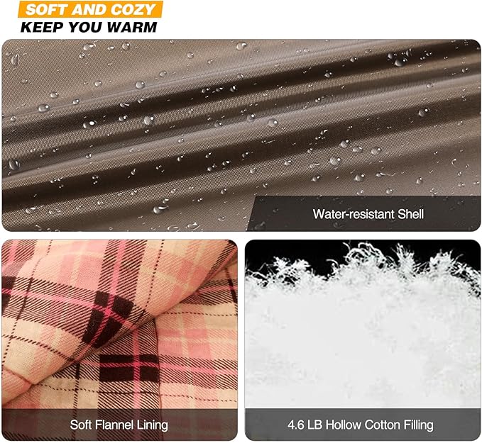 - Soft and Durable: The outer shell of the 2 person sleeping bag is made of water-resistant and ripstop 210T polyester. Soft flannel lining, filled with high-density hollow cotton, which is comfort for you to release the fatigue of the day.