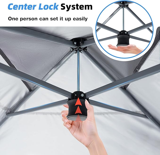 - Installation in Seconds: This 10x10 pop up canopy adopts a center-lock structure, which can be easily and quickly set up without tools. You just take the assembled frame out of the bag, pull open, put the fabric over the frame, push the center locking button, and you are done