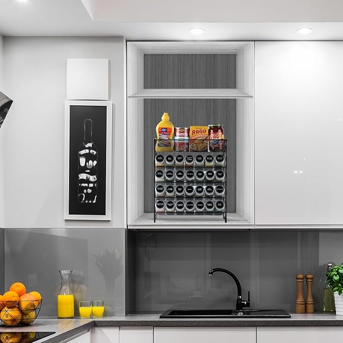 - 5 Tier Spice Rack - Made of strong steel and powder coatings electrostatic spray finished.Ideal sized spice rack organizer for cabinet, countertop, pantry, cupboard, door or wall mount. Inclined design make it easy to locate and quickly grab what you need, turn any mess of spice into an organized masterpiece .