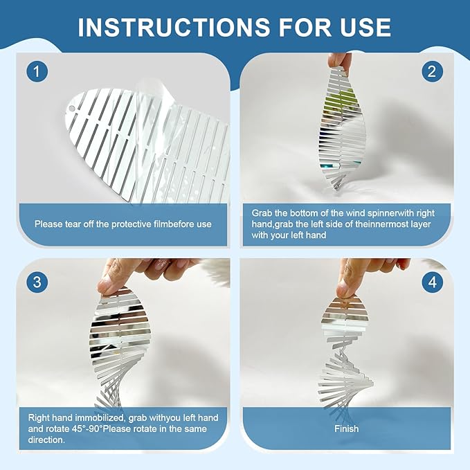 - 【Fishbone Wind Spinners Outdoor】By laser-cutting technology to form large fishbone shape, it's material with strong corrosion resistance, wear resistance, reflective and rust resistance. This Fishbone strands of wind spinner for outside includes 1pcs double-sided mirror wind turntables, 360-degree stronger metal rotating hooks for easy hanging. 17 inch in total long. It makes it visible even from a distance. Notice: Protective plastic film adheres to both sides of the fishbone, which needs to be peeled off before expanding the fishbone into 3D form