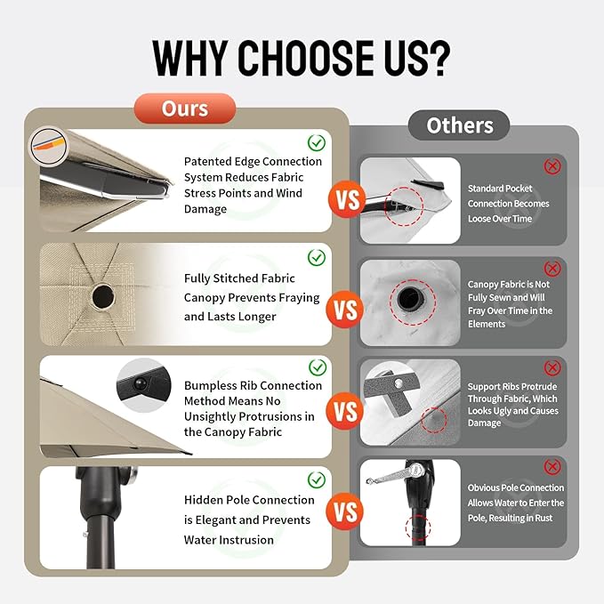 - 【Heavy-Duty Construction & Dual-Shell Top】The frame combines screws and wire for hidden reinforcement, offering both durability and a clean look, effectively preventing water intrusion. The double-shell umbrella top adds extra sturdiness, while the fully stitched top prevents fraying and extends the life of your patio umbrella.