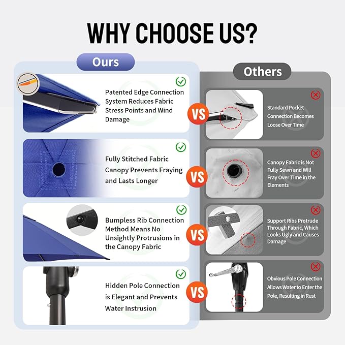 • 【Heavy-Duty Construction & Dual-Shell Top】The frame combines screws and wire for hidden reinforcement, offering both durability and a clean look, effectively preventing water intrusion. The double-shell umbrella top adds extra sturdiness, while the fully stitched top prevents fraying and extends the life of your patio umbrella.