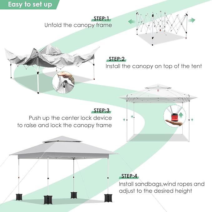 - ONE BUTTON EASY SET UP: Outdoor pop up canopy uses one-touch center locking technology. Gently push center hub on top of party tent to complete locking. Pushing red locking plate of tent, and pulling center down until it is free of center post to disassemble the tent