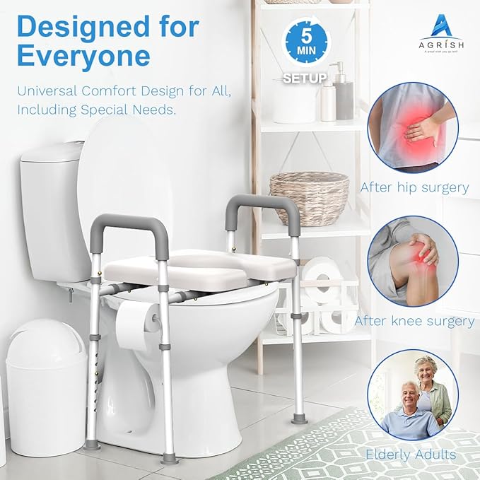 - DESIGNED FOR ALL: Our free-standing safety toilet frame is suitable for people of different heights. It is an essential tool for those recovering from surgery, such as a broken hip, femur, Achilles tendon. The armrests offer support for users when sitting down or standing up, while the leg pads prevent slipping or shifting during use
