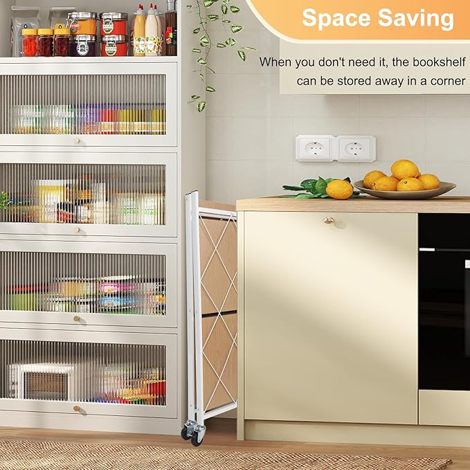 - EASY TO ASSEMBLE: The folding shelves simply open the frame and adjust the shelves on top. The whole process takes less than 30 seconds, no assembly and no tools required. When not in use, it can be folded, and when folded, it measures only 3.74 inches, so it can be placed in any corner. Can also be used as garage storage, rolling bookshelf, kitchen storage, commercial shelving, etc. Perfect for storing kitchen utensils, books, files, tools, sales items, crafts and unused clutter.