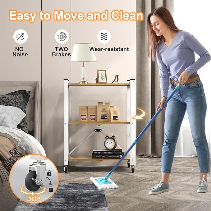- FOLDABLE DESIGN: If you are looking for folding racks shelves, our one-piece folding frame design will be your first choice. In addition to the folding design, our storage racks also come with larger 360° free-spinning lockable casters that can be easily moved around, making them the perfect choice for rolling storage racks. Best of all, when you want to clean up your space, the four gimbaled wheels allow you to move freely without being restricted by terrain for easy cleaning.