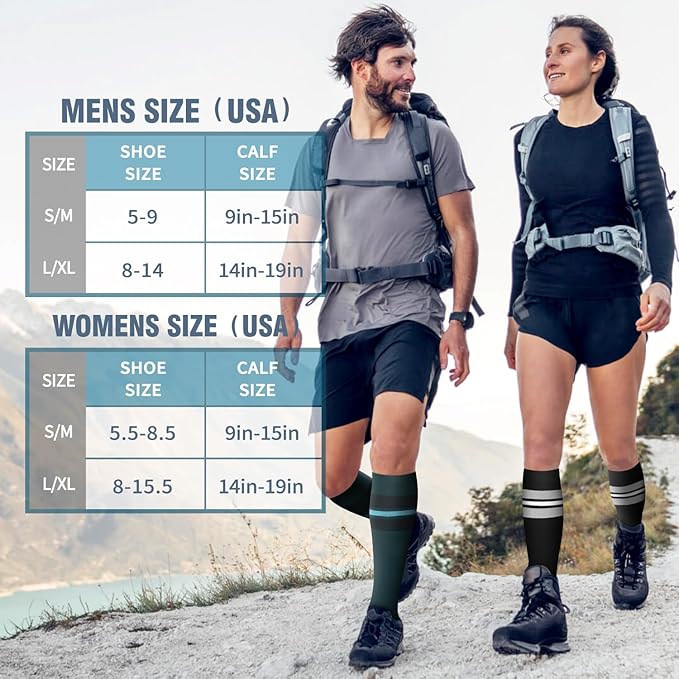 • GIVE LIFE TO YOUR LEGS! - More improve circulation means more Healthier legs and less pain+swelling.Our Graduated Compression Socks put pressure in just the right spots.Provides true graduated compression to support your legs,reduce fatigue,soreness,and prevent injuries at the same time.Progressive compression technology has been recognized by many users Our copper compression socks is self-care staples.Make you feel great-no matter where,no matter when,and no matter what you're up to!