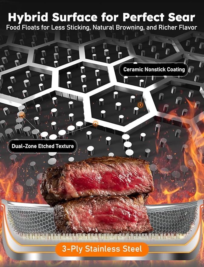 - 3-PLY STEEL FOR PERFECT SEARING: This premium Skillet features a 3-ply stainless steel core and 2-layer ceramic coatings, with a full-surface dual hexagon texture of variable heights that lifts food to reduce sticking and protect the bottom coating from wear. Compared to typical aluminum core fry pans, its 3-ply stainless steel core extends the lifespan up to 5X longer, making it perfect for frequent high-heat searing, grilling, frying, while delivering natural browning and richer flavor