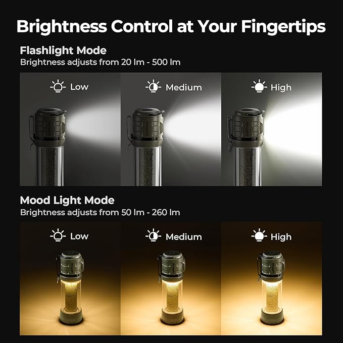 - Dual Functionality with 8 Brightness Modes: Offering both flashlight and ambiance light options, each featuring low, medium, high, and strobe settings, our portable camping lantern is ideal for camping, hiking, and creating a cozy atmosphere