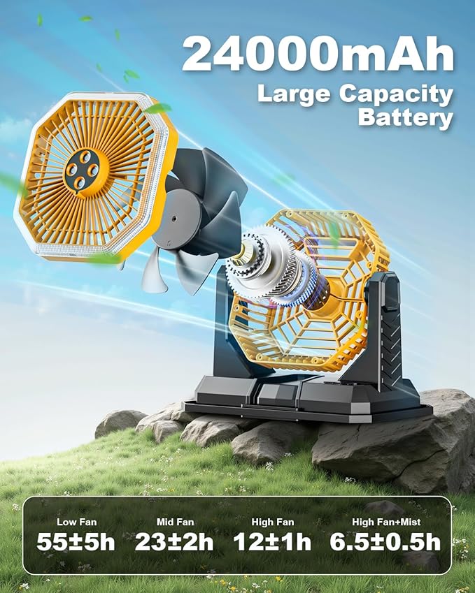 - 【Three wind speeds + 60H long life】 3-speed wind speed at your choice: 1-speed (2.2m/s silent energy saving, range 60±2 hours), 2-speed (2.7m/s balanced air supply, range 25±2 hours), 3-speed (3.5m/s raging wind power, range 12±2 hours)! With 24000mAh industrial battery, camping, outdoor work without power outage anxiety!