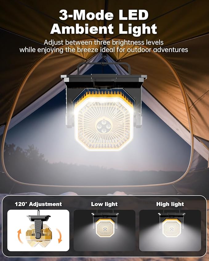 - 【Detachable storage+58 LED three-level lighting】 3 seconds of storage, saving 50% space, easily fit into the vehicle as a portable camping fan! Built in three levels of LED lights (58 beads), white light (high brightness operation), warm light (night atmosphere), and dual light mixing (multifunctional lighting), outdoor safety and convenience are achieved at the same time!
