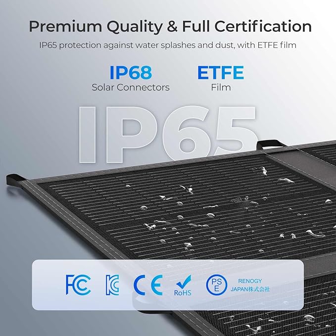 - [Durable & Easily Carry] Built for adventure, this rugged IP65-rated 400w solar panel blanket thrives in extreme temps (-10°C to 65°C) with military-grade ETFE lamination and reinforced stitching. Adopting flexible solutions to efficiently reduce the problem of hidden cracks which can extend the life span. The padded carry handle and adjustable shoulder straps make transport a breeze.