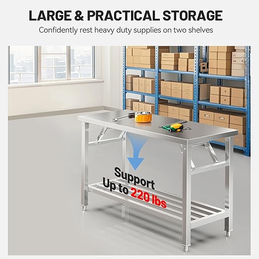 - 【Extra large storage space】This stainless steel table has a tabletop size: 44 x 20inch Height: 31.5inch.When you need an emergency folding work table, you can easily unfold it and finish your work.And it also comes with a lower removable shelf, making it easy for you to get more storage space.