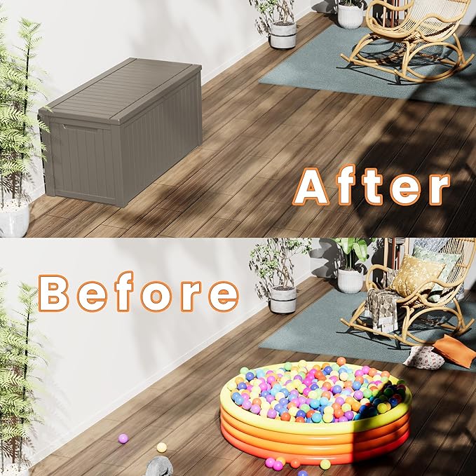 - Material: The patio outdoor storage box is made of the latest high-quality resin material, which makes this patio deck storage box waterproof, UV-resistant, anti-fading, and anti-bending protection, suitable for long-term outdoor use.