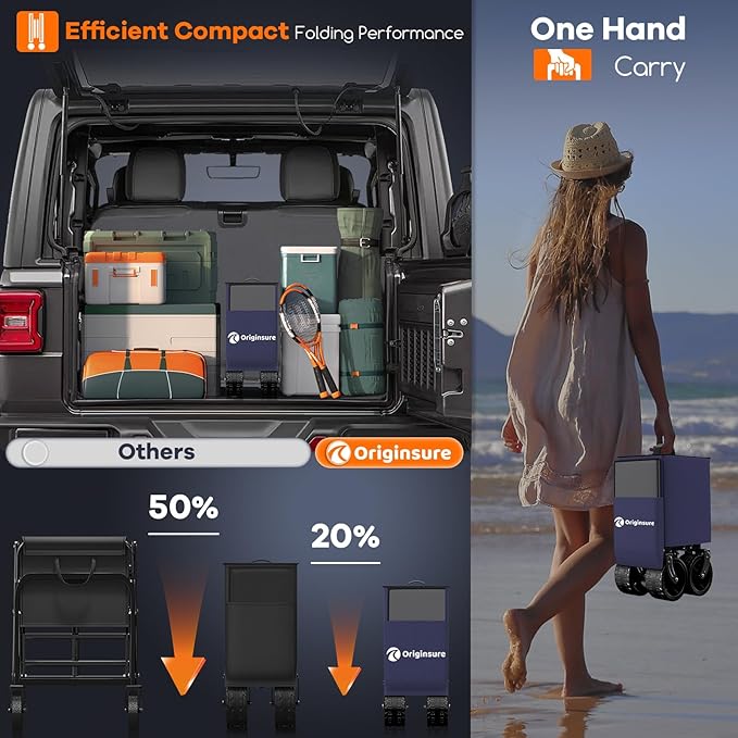 - ใ๐ฃ๐ฟ๐ผ๐ฑ๐๐ฐ๐ ๐ฆ๐ถ๐๐ฒ & ๐๐ฐ๐ฐ๐ฒ๐๐๐ผ๐ฟ๐ถ๐ฒ๐ใOriginsure folding carts unfolded size: 37.40"x 24.21"x 24.00"(42.52"), folded size๏ผ9.06"x 12.20"x 24.00", wheel size๏ผ7"x 4", handle height from Ground: 42.52", with 1 Side Pocket, 2 Mesh Cup holders, 1 Storage Cover, and 1 Strap. Ready to use right out of the box, no assembly required.