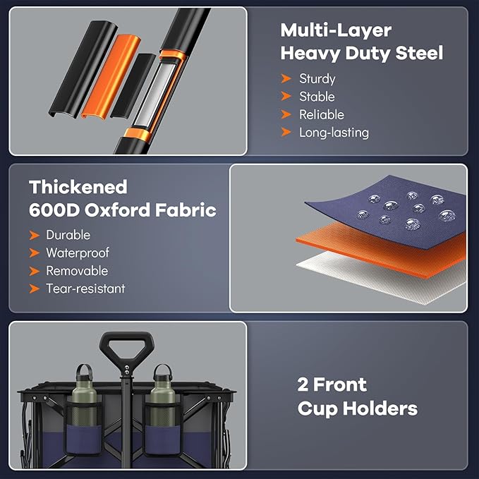 - ใ๐ฐ๐ฒ๐ฌ๐๐ ๐ช๐ฒ๐ถ๐ด๐ต๐ ๐๐ฎ๐ฝ๐ฎ๐ฐ๐ถ๐๐ ๐๐ฒ๐ฎ๐๐ ๐๐๐๐ ๐จ๐๐ถ๐น๐ถ๐๐ ๐ช๐ฎ๐ด๐ผ๐ป ๐๐ฎ๐ฟ๐๐ ๐๐ถ๐๐ต ๐ฆ๐๐๐ฟ๐ฑ๐ ๐๐ถ๐ด๐ต-๐๐๐ฟ๐ฒ๐ป๐ด๐๐ต ๐๐น๐น-๐บ๐ฒ๐๐ฎ๐น ๐๐ฟ๐ฎ๐บ๐ฒใOur outdoor collapsible cart is made of solid mental frame, 20% thicker than other carts. Featuring innovative structural design, static load capacity up to 460lb and dynamic load capacity up to 330lb, ideal for grocery, shopping, camping, garden, sports, travel. With double-layer thickened durable 600D Oxford fabric, waterproof, wear-resistant and tear-resistant, ensuring stable support for all your gear.