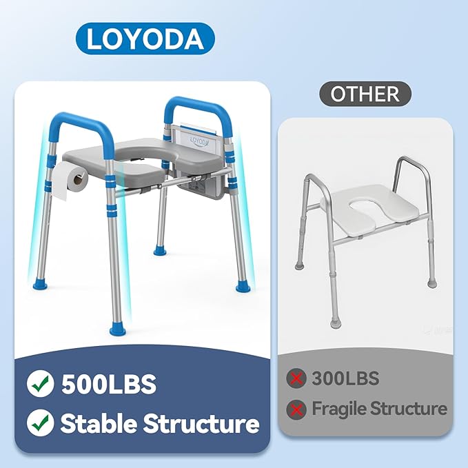 - FSA or HSA Eligible: The Loyoda raised toilet seat made from sturdy aluminum alloy, supports up to 500 lbs. Features four outward-tilted legs for enhanced stability, eliminating any risk of shaking