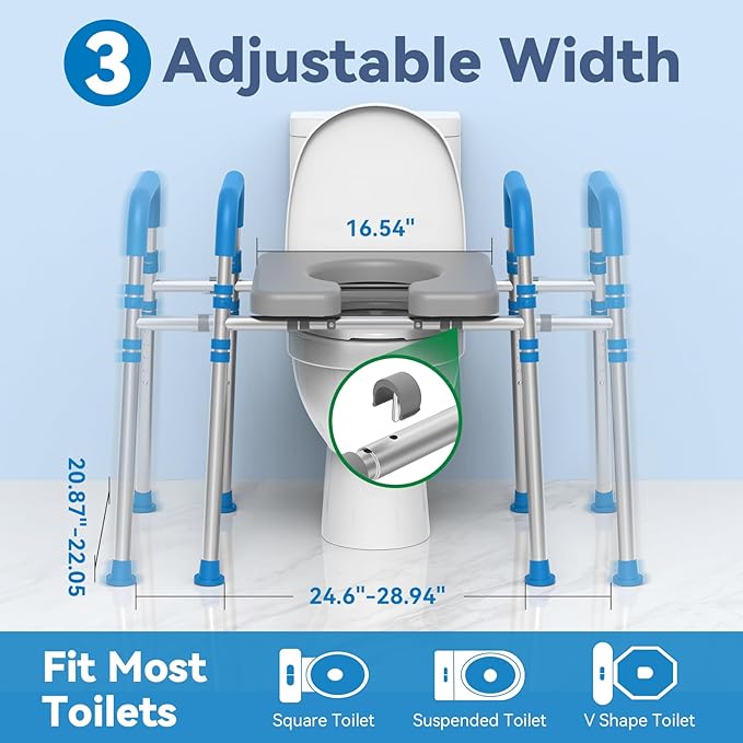 - Customizable Fit: Adjustable height from 25" to 30" and width from 24" to 29" allows a tailored fit for various user heights and toilet sizes, perfect for seniors, the handicapped, and those needing extra support