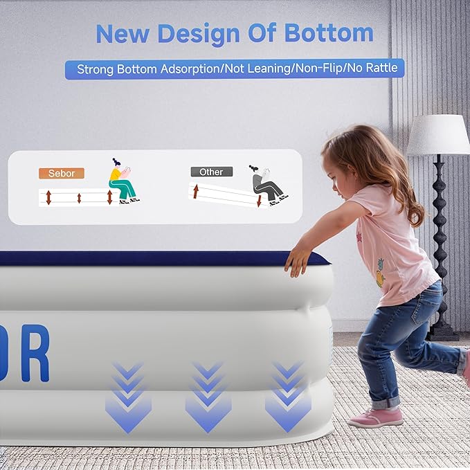 - Stable & Quiet Design: Featuring a non-slip bottom design, the Sebor air mattress ensures maximum stability, preventing tipping and reducing noise. This stable and quiet design allows you to enjoy a peaceful and undisturbed sleep, whether you're at home or in a tent, making it a perfect addition to any sleeping arrangement.