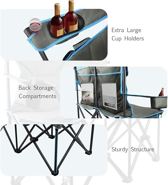 Folding Camping Chair - Oversize Camping Chairs for Adults, 2 Seat Folding Chair Support 650lbs with Pillows & Cup Holders & Cooler Bags- Heavy Duty Chair for Sports Garden Beach Fishing(Bluegray)