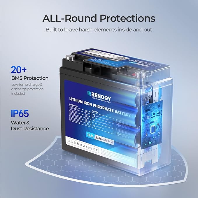 Renogy 12V 20Ah Trolling Motor Lithium Lifepo4 Battery, Built in 20A BMS, IP65 Waterproof Rated, 50% Lighter Deep Cycle Battery for kayaks, scooters, or emergency kits