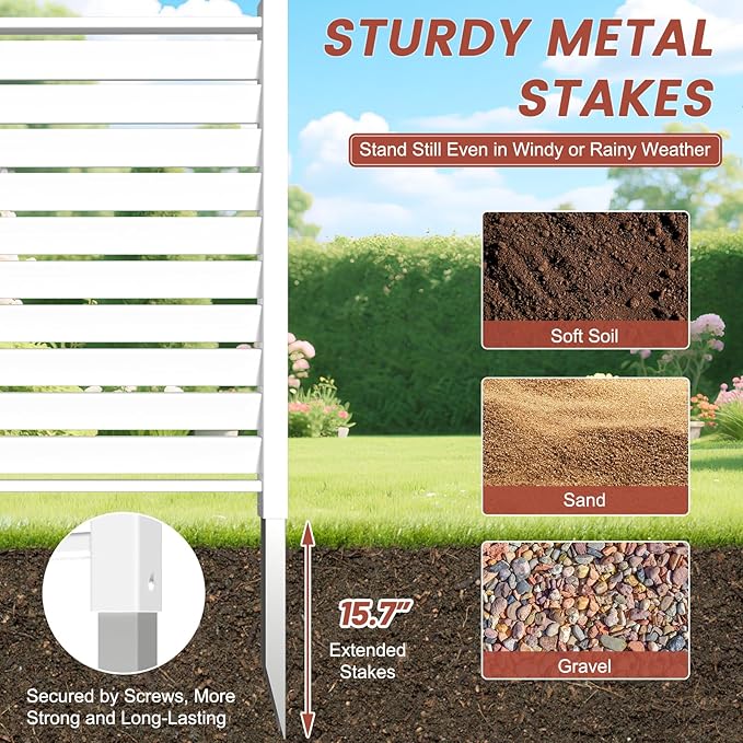 - Durable and Sturdy: This premium pvc fence panel comes with pointed metal ground stakes, which is weather-resistant, ensuring long-lasting outdoor use, the metal stakes can go deep into the ground up to 15 inches deep, ensuring good windproof performance, and not easy to overturn
