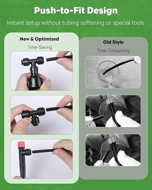 - Push-to-Fit Design: No tubing softening or special tools required! Simply push the tubing into the inlets of the sprinklers or connectors for instant setup. To detach it, just press the inlets and pull out the tubing. Greatly save you time and effort