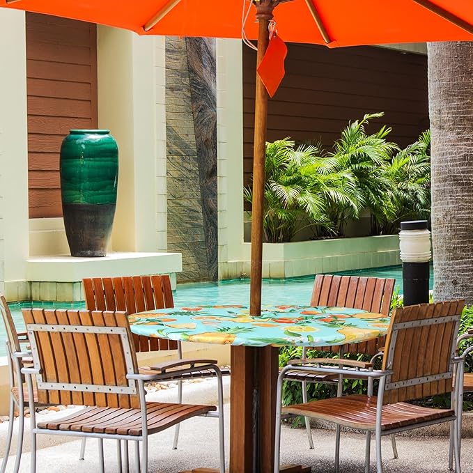 - Round Fitted Tablecloth Set: the package includes 2 lemon outdoor round tablecloths, each with an umbrella hole and a hidden zipper; The patio table cover has an elastic band around it so it can be firmly fixed on the table without sliding