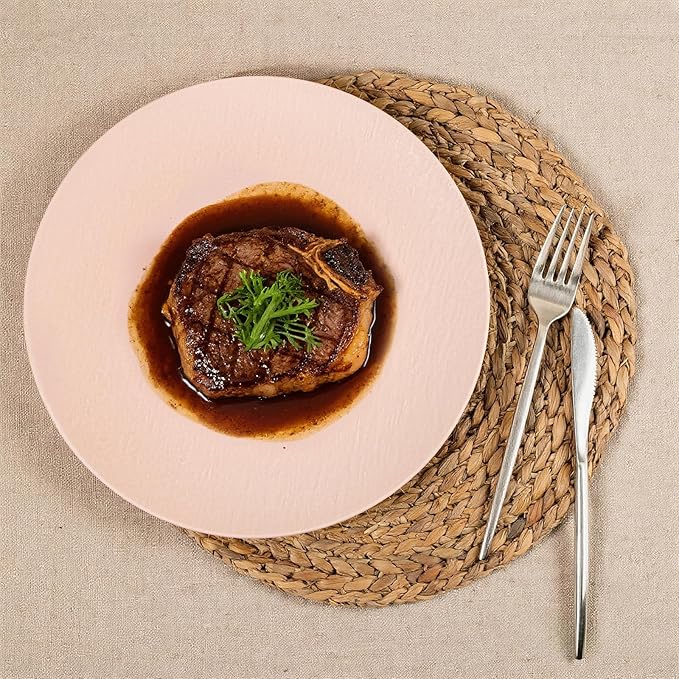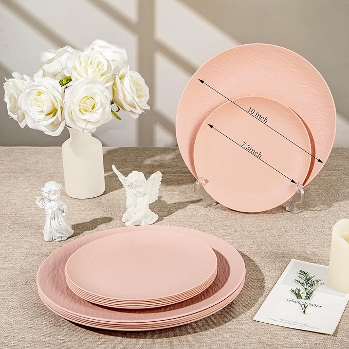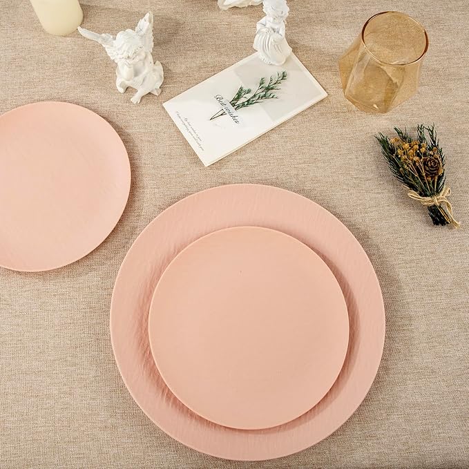 - EXQUISITE FROSTED DESIGN:This plastic dinnerware set combines soft pink with frosted stone texture brings a sweet,playful vibe.The charming hue and matte finish shine at girl’s parties or bridal events,adding a cheerful touch without sacrificing practicality.