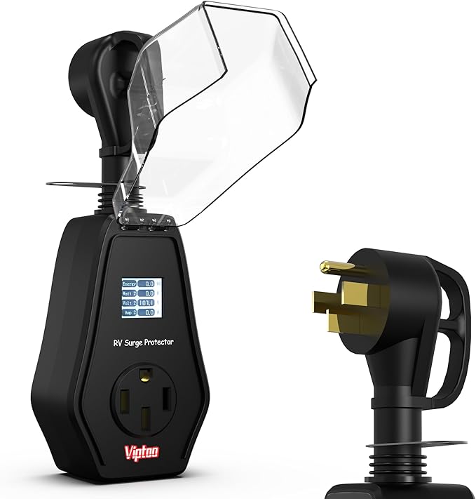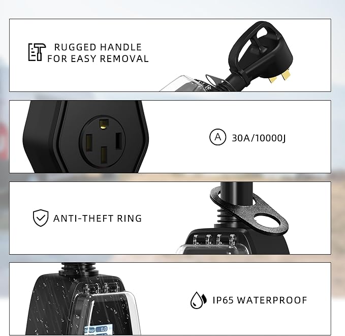 - IP65 WATERPROOF & OVERSIZED COVER FOR PLUG PROTECTION: Designed with outdoor safety in mind, this surge protector features a weatherproof housing and oversized protective cover that fits a wider range of RV power plugs. Keeps your connection safe from rain, dust, and debris in all weather conditions