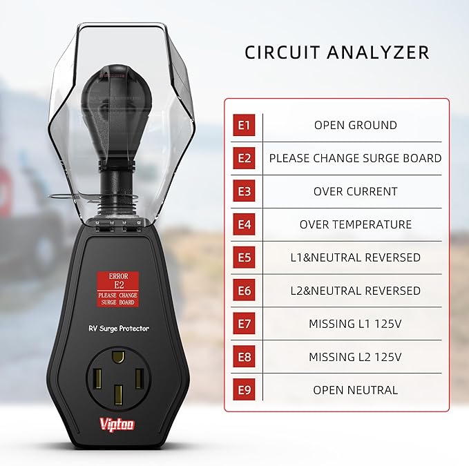 - CIRCUIT ANALYZER WITH REAL-TIME MONITORING: Test the power quality before connecting your RV. This device helps verify correct wiring and detects most common electrical faults. Our surge protector features a bright, oversized 1.77-inch LED display, providing real-time voltage readings and clear error code indicators for added safety and convenience
