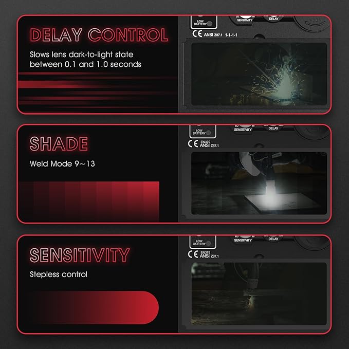 - Fast Auto-darkening: 2 premium arc sensors trigger darkness in 1/30000 sec. Features adjustable sensitivity and delay controls for optimal performance in any lighting/arc condition