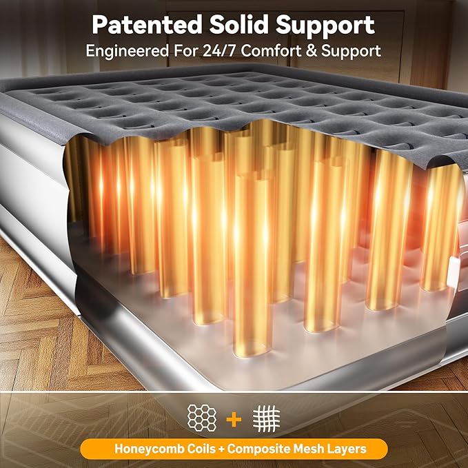 - 【2025 Upgraded Patented Coils & Structure Design–Covered By U.S. Patent NO. US012108880B2】,The queen air mattress features internal coils in a honeycomb pattern, reinforced by composite mesh and fiber layers.This advanced structure distributes weight evenly across the 18" height, prevents sagging, and supports up to 660 lbs without bottoming out