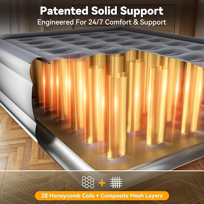 - 【2025 Upgraded Patented Coils & Structure Design–Covered By U.S. Patent NO. US012108880B2】The full air mattress features 28 internal coils in a honeycomb pattern, reinforced by composite mesh and fiber layers.This advanced structure distributes weight evenly across the 18" height, prevents sagging, and supports up to 660 lbs without bottoming out