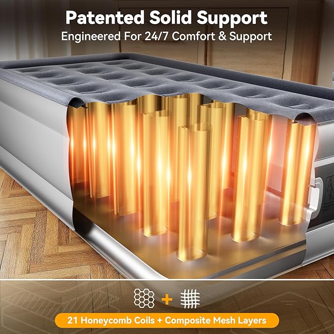 - 【2025 Upgraded Patented Coils & Structure Design–Covered By U.S. Patent NO. US012108880B2】The twin air mattress features 21 internal coils in a honeycomb pattern, reinforced by composite mesh and fiber layers.This advanced structure distributes weight evenly across the 18" height, prevents sagging, and supports up to 330lbs without bottoming out