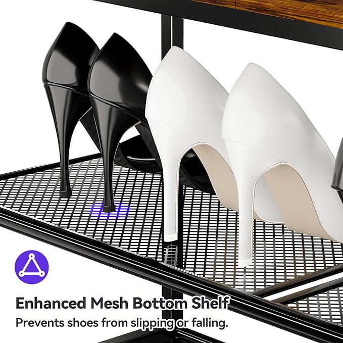 - [Sturdy Structure] Made of high quality particleboard, a steel frame, and dense mesh shelves,also waterproof and rustproof. And the equipped adjustable feet keep it well balanced,this rack can support your shoes firmly and reliably.