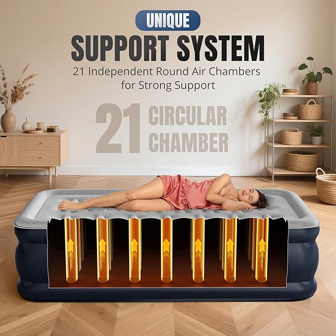 - Innovative Independent Support System: Our inflatable mattress features a unique independent support system composed of multiple air chambers. Each chamber operates independently, adapting to your body shape and movements to provide targeted support precisely where you need it most. This design not only enhances overall comfort but also helps reduce pressure points, ensuring a peaceful sleep for people of all body types.