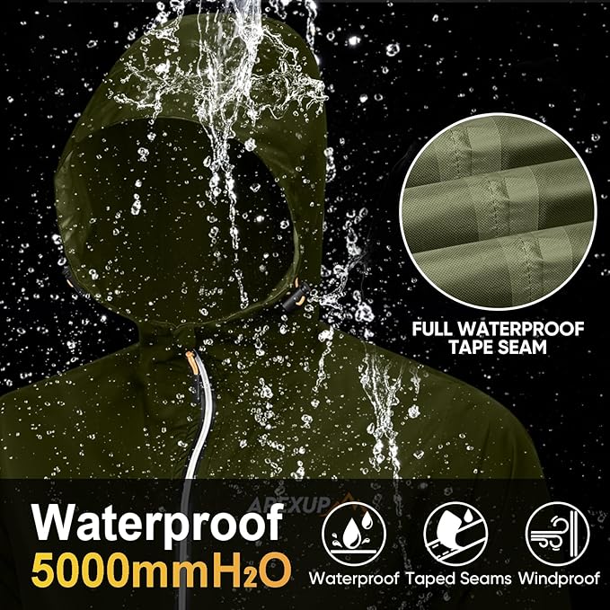 • Waterproof and Windproof: APEXUP men's rain jacket is made from tear-resistant, high-density polyester with waterproof zippers; It features a premium waterproof coating and hot-pressing sealed seams, ensuring a 5000-8000mm waterproof rating to keep you dry in any weather