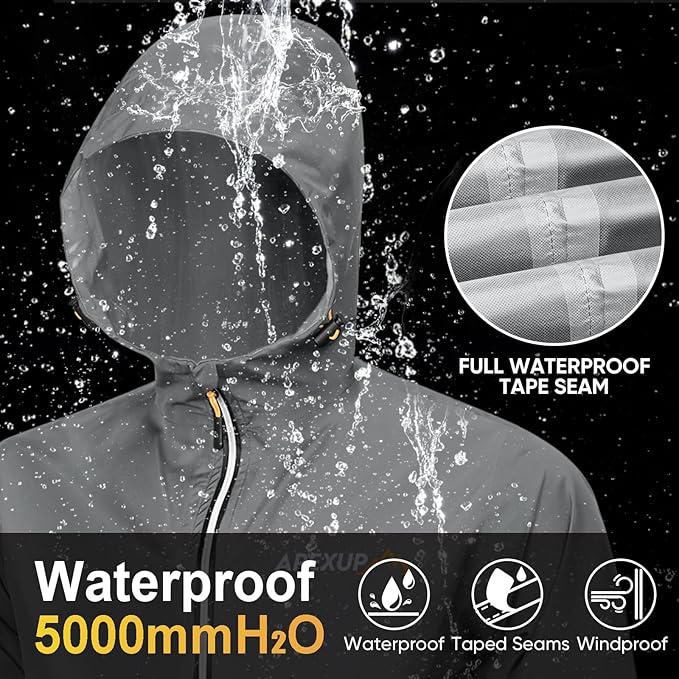 • Waterproof and Windproof: APEXUP men's rain jacket is made from tear-resistant, high-density polyester with waterproof zippers; It features a premium waterproof coating and hot-pressing sealed seams, ensuring a 5000-8000mm waterproof rating to keep you dry in any weather